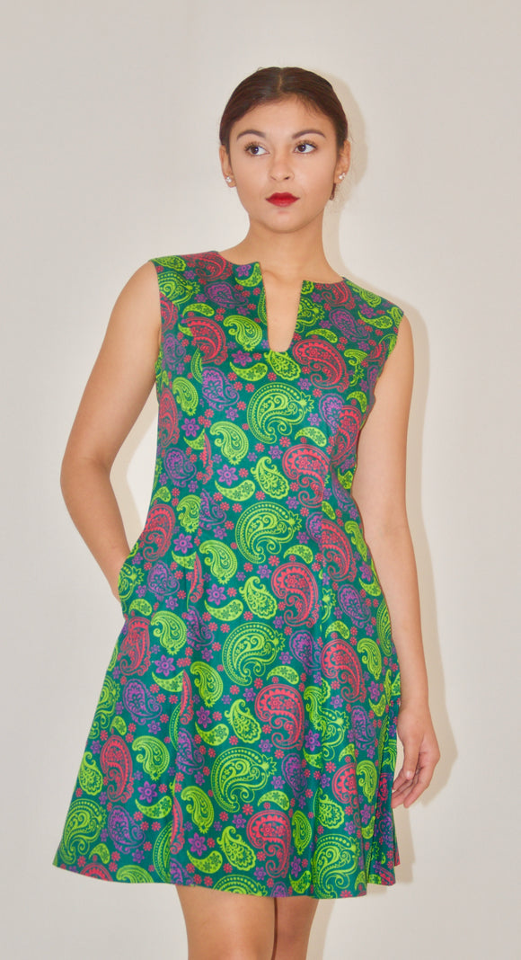 Green and Pink Paisley Print Cotton Poplin A-Line Dress