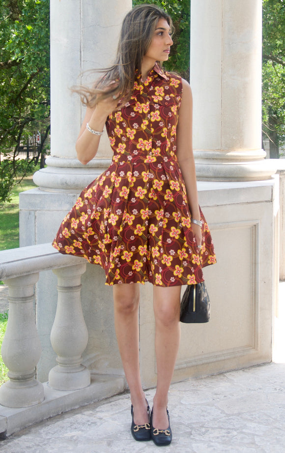 Brown Floral Print Sleeveless Shirtwaist Dress