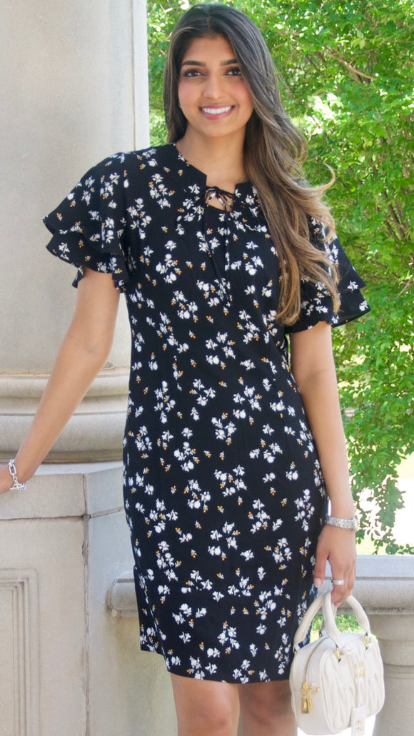 Black Floral Print Short Flutter Sleeve Fitted Dress