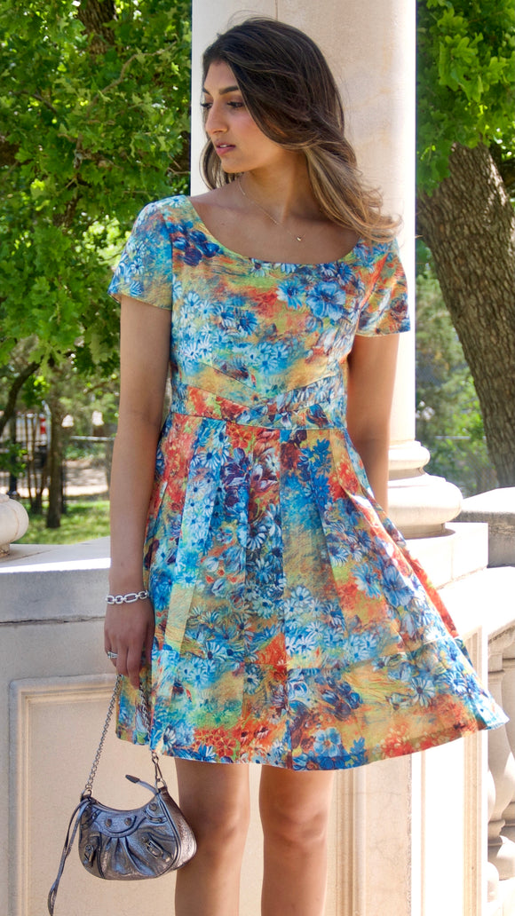Floral Mural Print Fit and Flare Knife Pleated Dress