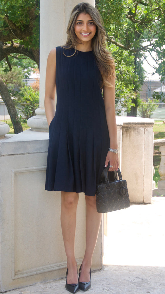 Dark Navy Short Sleeve Pleated Drop Waist Shirtdress