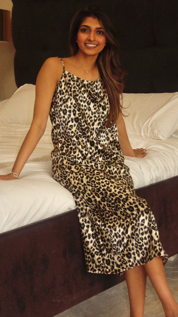 Leopard Print Silk Satin Spaghetti Strap Midi Nightgown