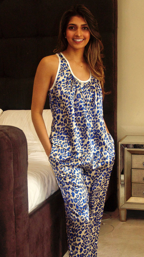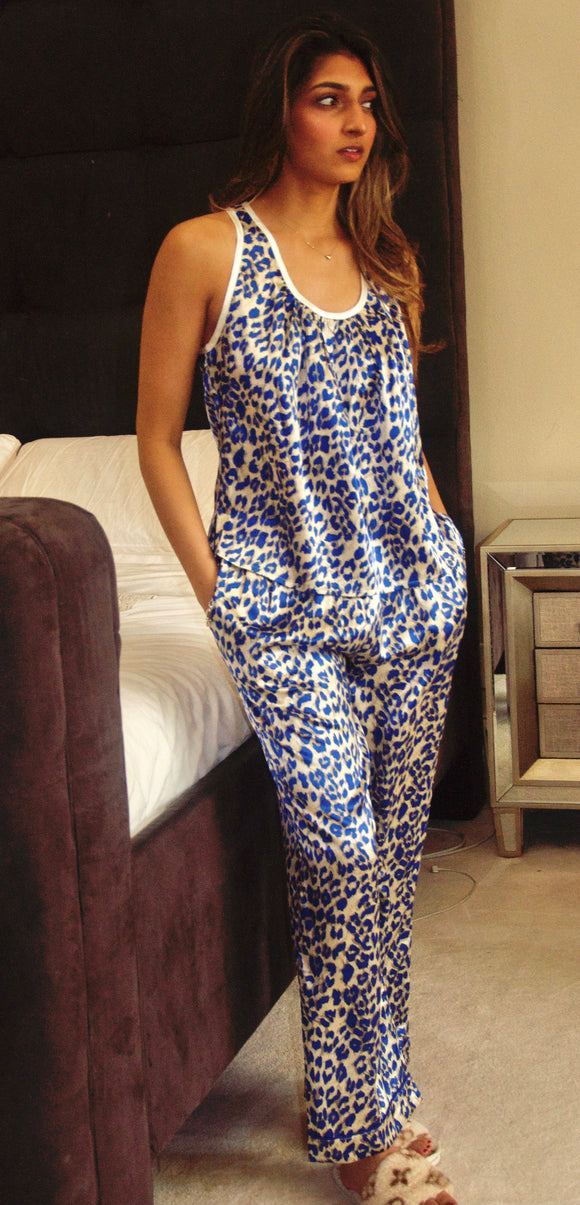 Blue Leopard Print Silk Satin Pajama Tank Top
