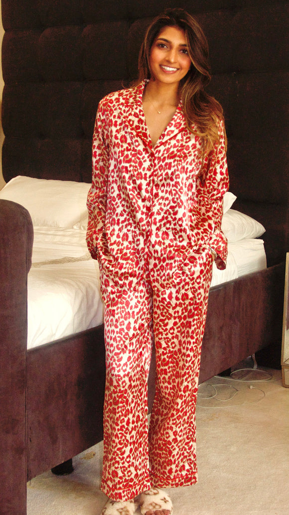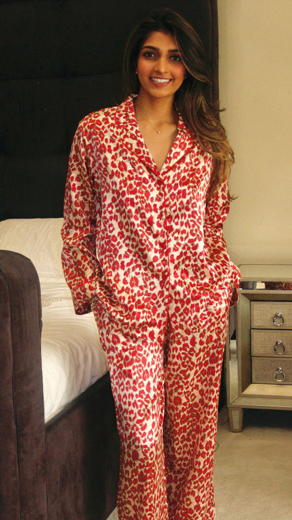 Red Leopard Print Silk Satin Long Sleeve Pajama Shirt