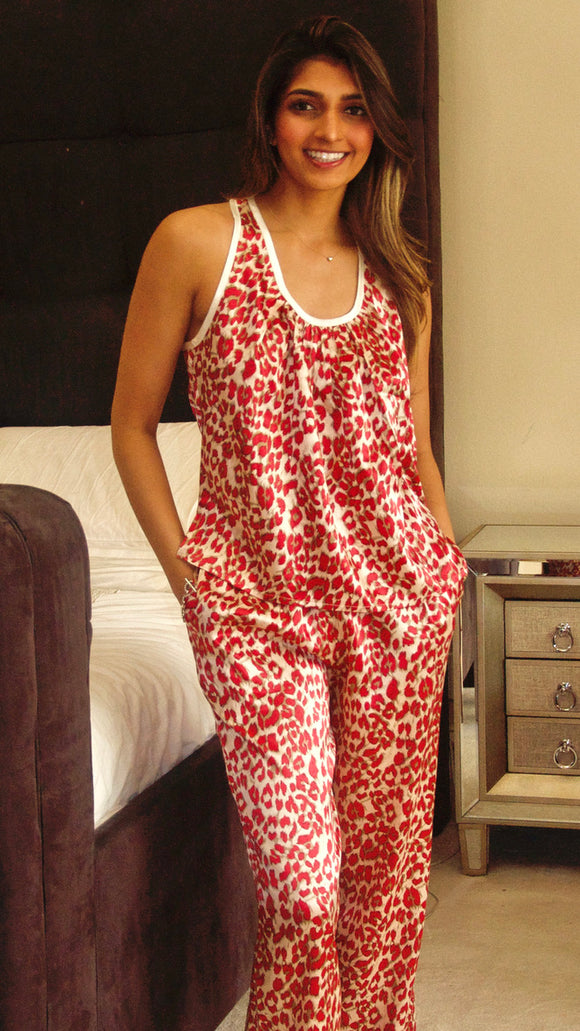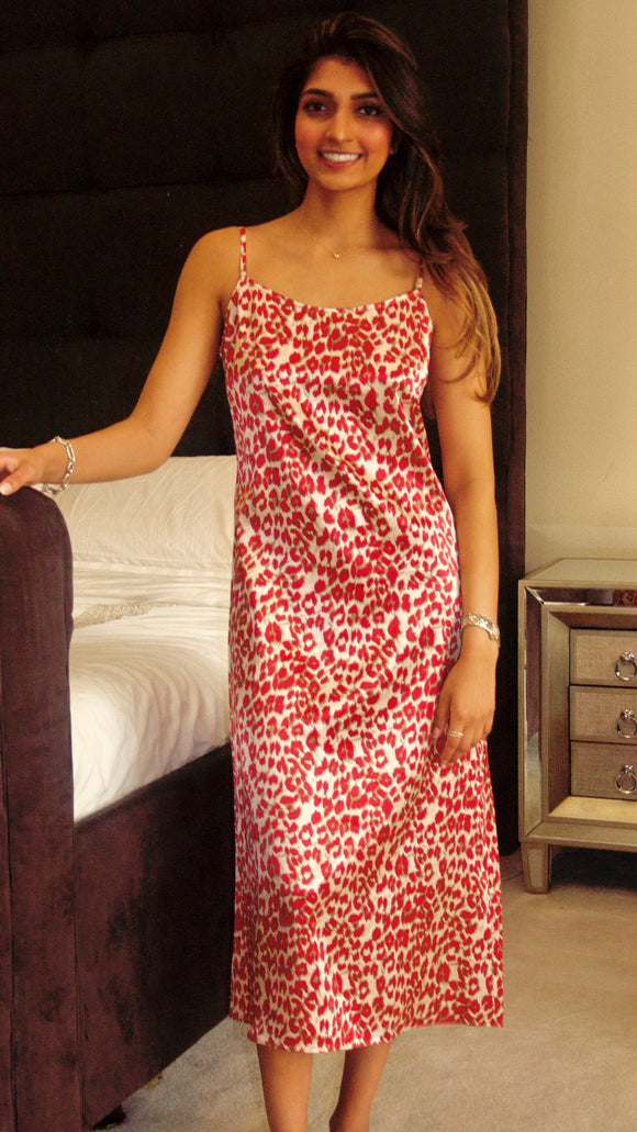 Red Leopard Print Silk Satin Spaghetti Strap Midi Nightgown