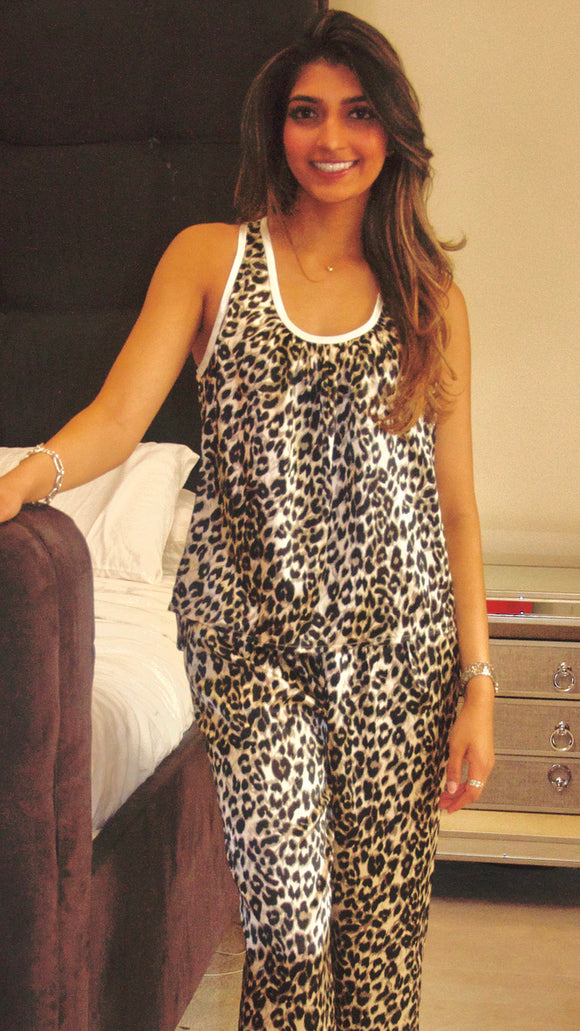 Leopard Print Silk Satin Ribbed Pajama Pants
