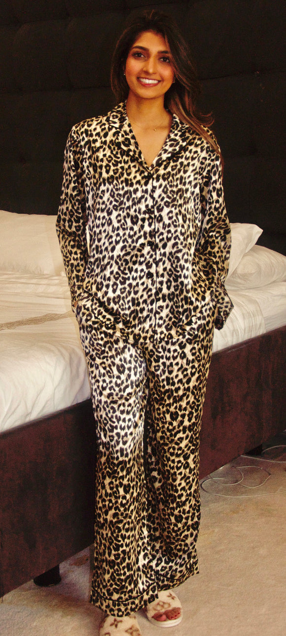 Leopard Print Silk Satin Long Sleeve Pajama Shirt