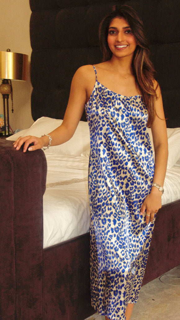 Blue Leopard Print Silk Satin Spaghetti Strap Midi Nightgown