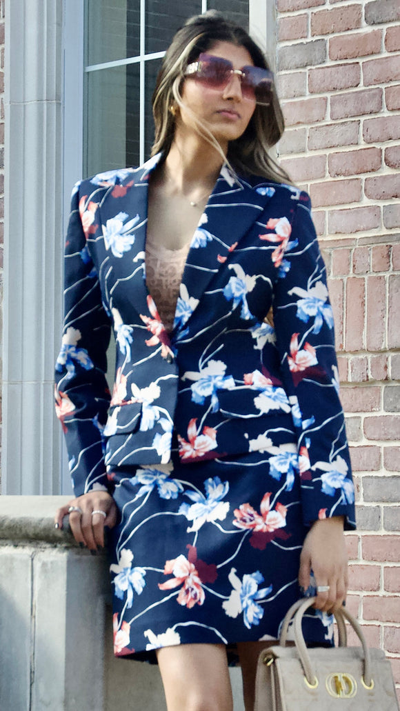 Navy Floral Print Slim Fit Single Breasted Jacket