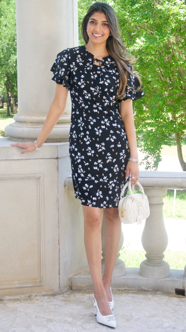 Black Floral Print Short Flutter Sleeve Fitted Dress