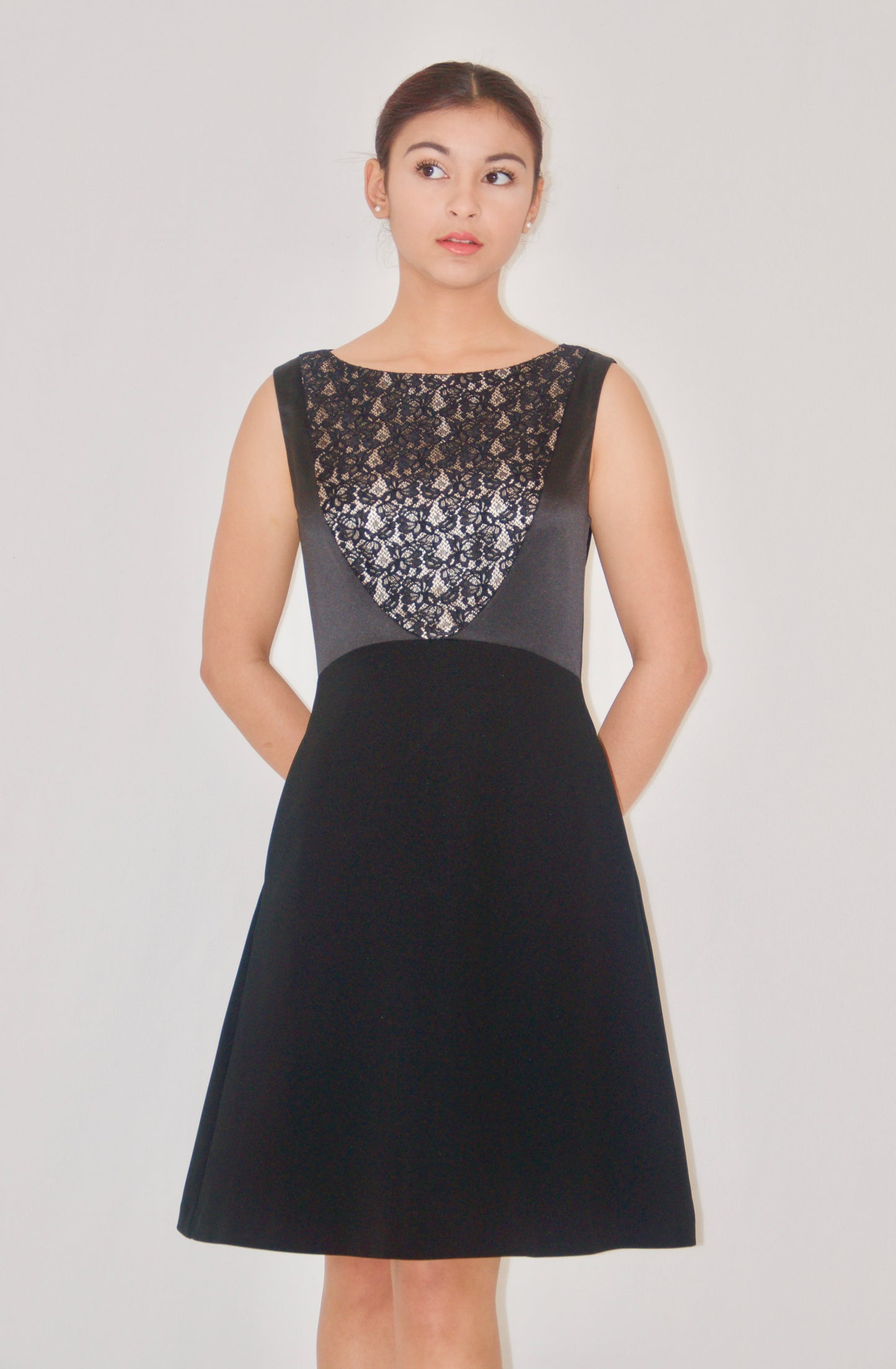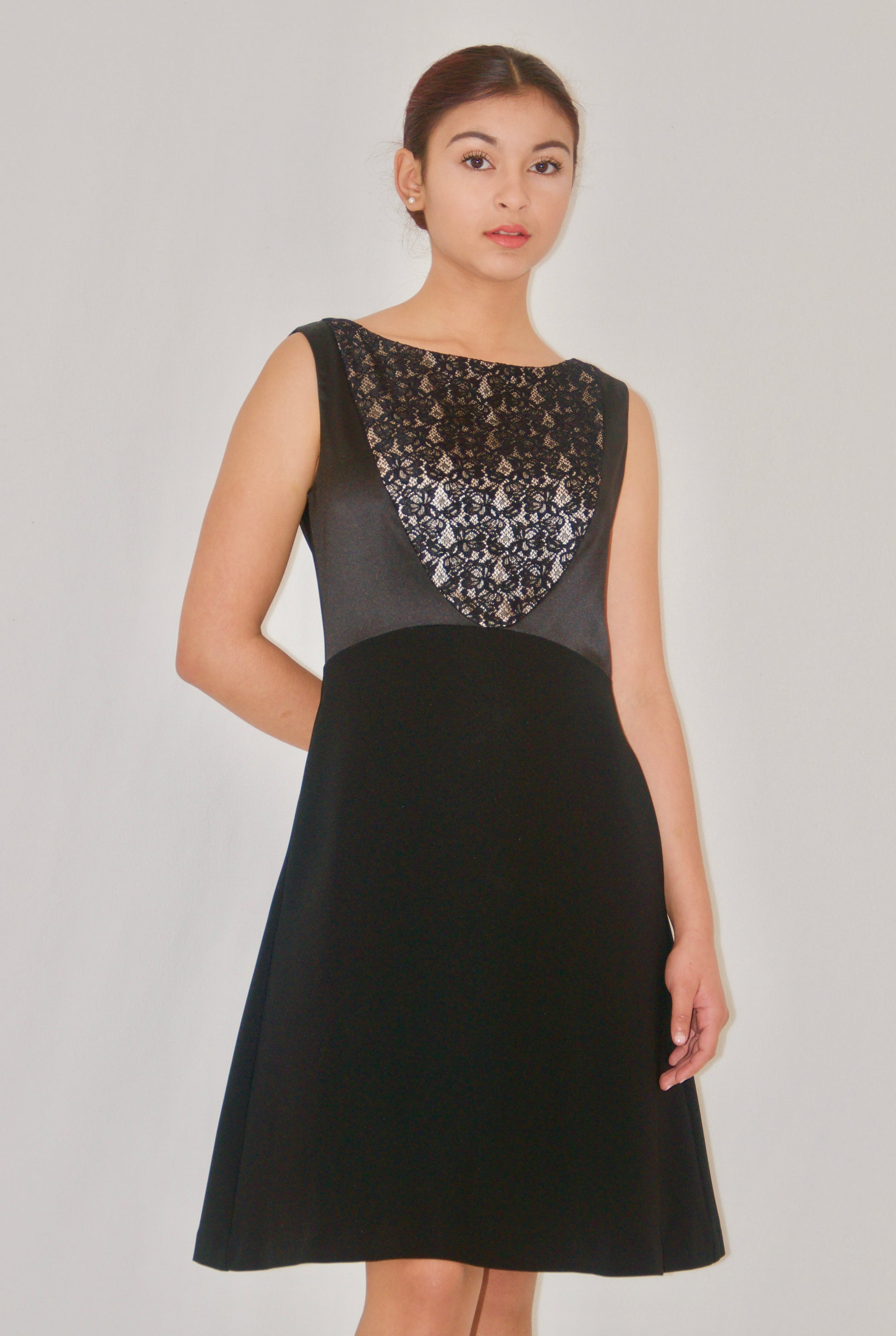 Black Lace Satin Embellished A-Line Dress - XS is backordered and will ship as soon as it is back in stock.