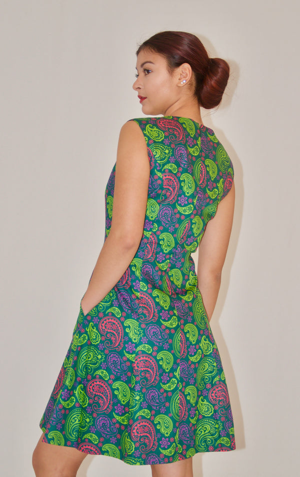Green and Pink Paisley Print Cotton Poplin A-Line Dress - XS is backordered and will ship as soon as it is back in stock.