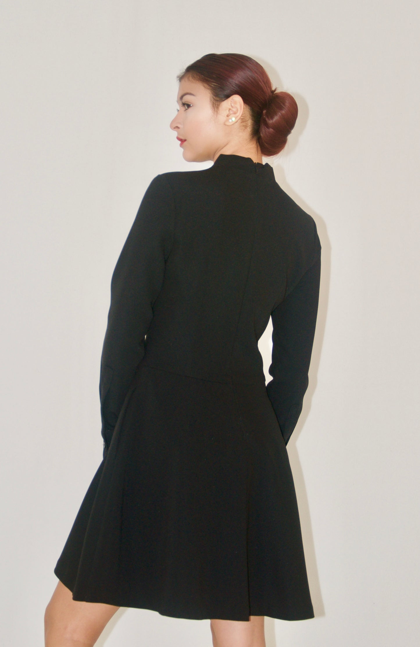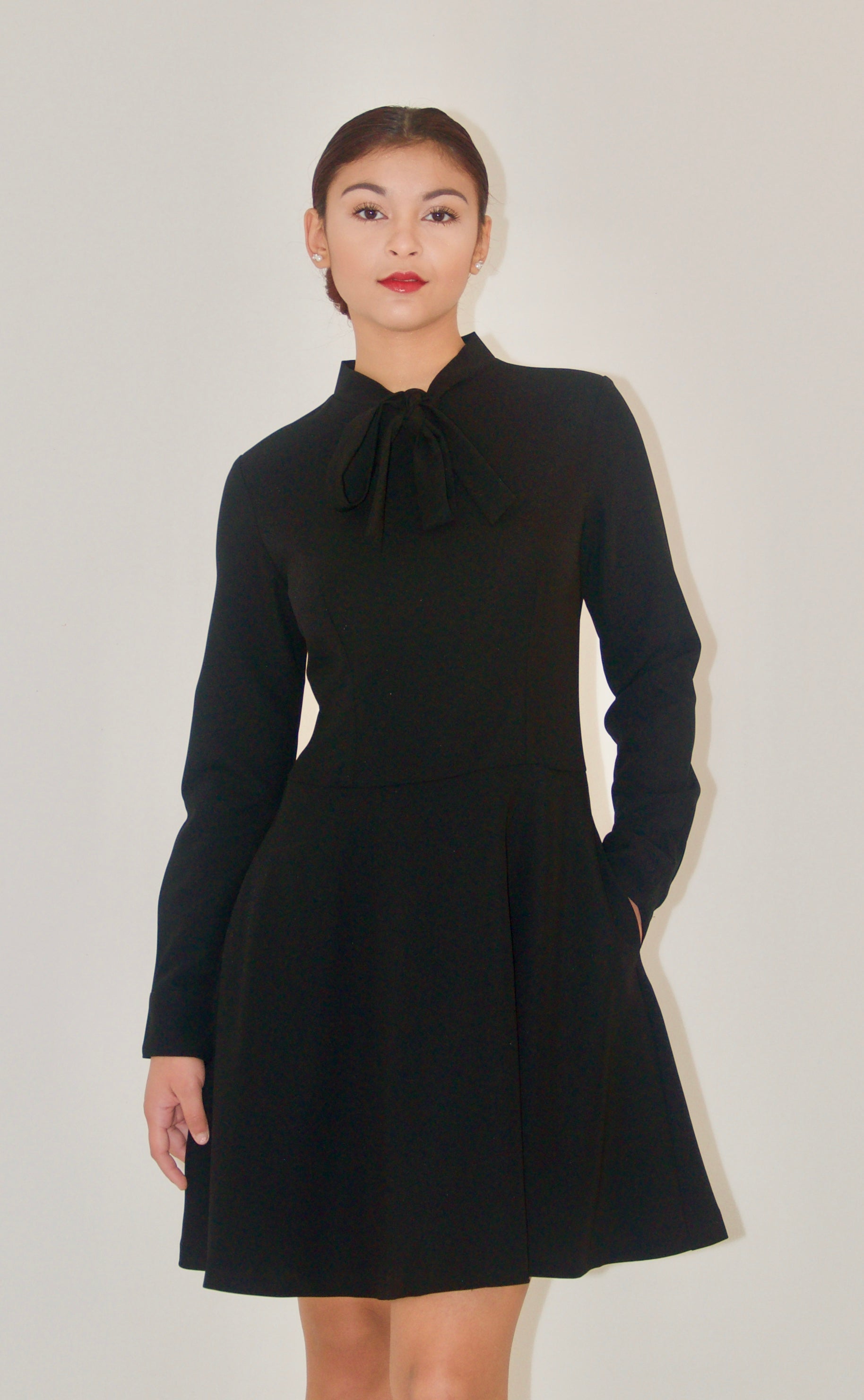 Black Long Sleeve Tie-Neck Mini Dress - XS is backordered and will ship as soon as it is back in stock.