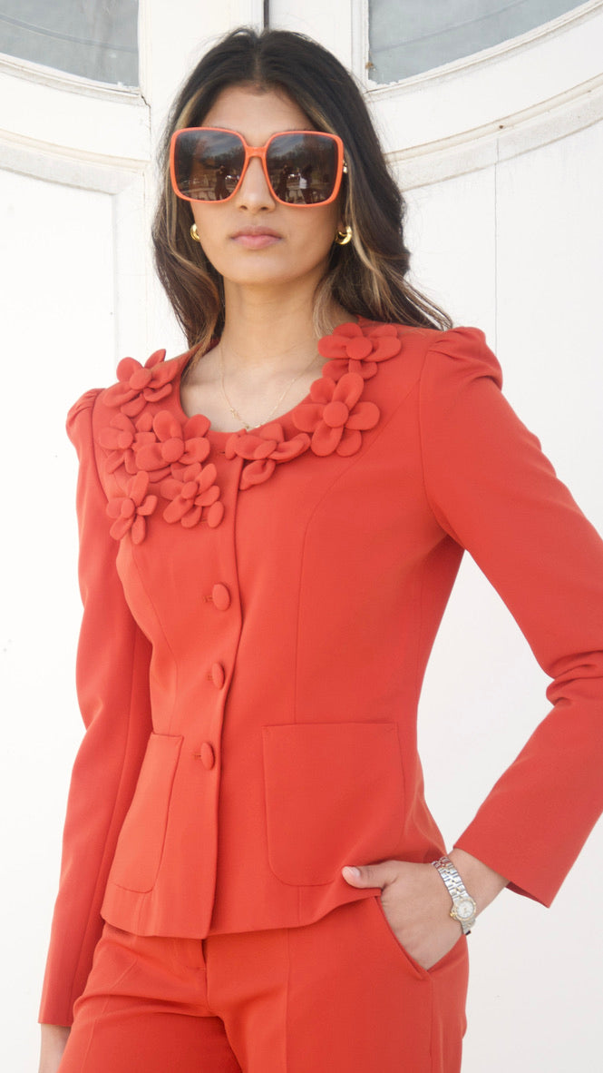 Rust Orange Floral Appliqué Round Slim Fit Jacket - XS is backordered and will ship as soon as it is back in stock.