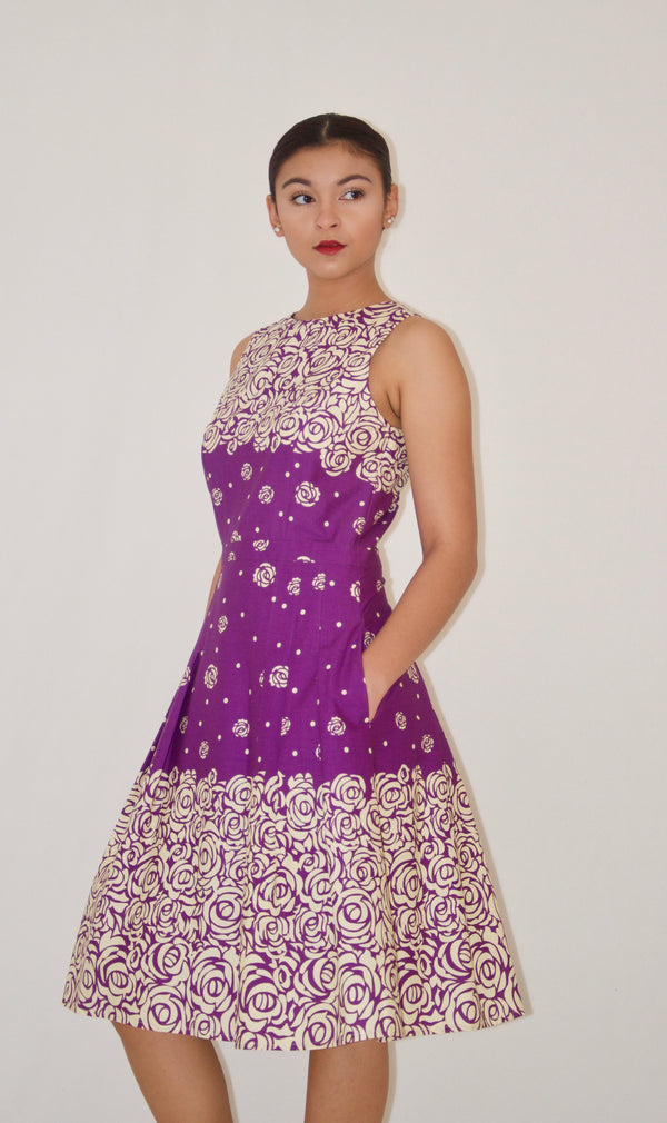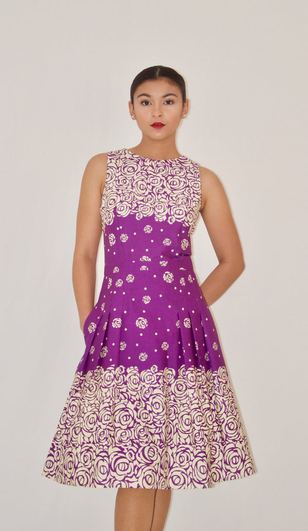 Purple and Cream Floral Print Cotton Poplin A-Line Dress