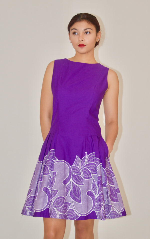 Purple Leaf Print Fit and Flare Cotton Poplin A-Line Dress - XS is backordered and will ship as soon as it is back in stock.