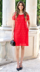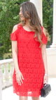 Red Lace Short Sleeve Cold Shoulder Shift Dress - XS is backordered and will ship as soon as it is back in stock.