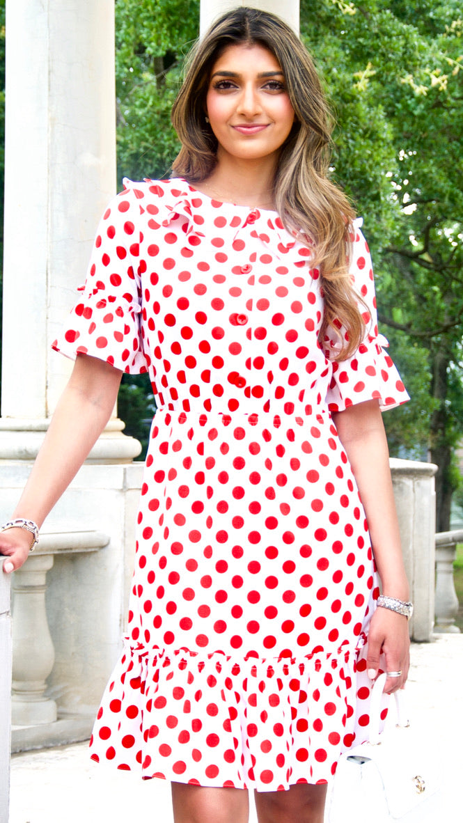 Red Polka Dot Fit and Flare Dress - XS is backordered and will ship as soon as it is back in stock.