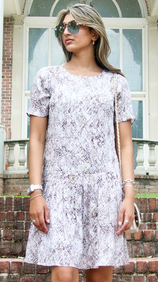 Snakeskin Print Short Sleeve Drop Waist Shift Dress - XS is backordered and will ship as soon as it is back in stock.